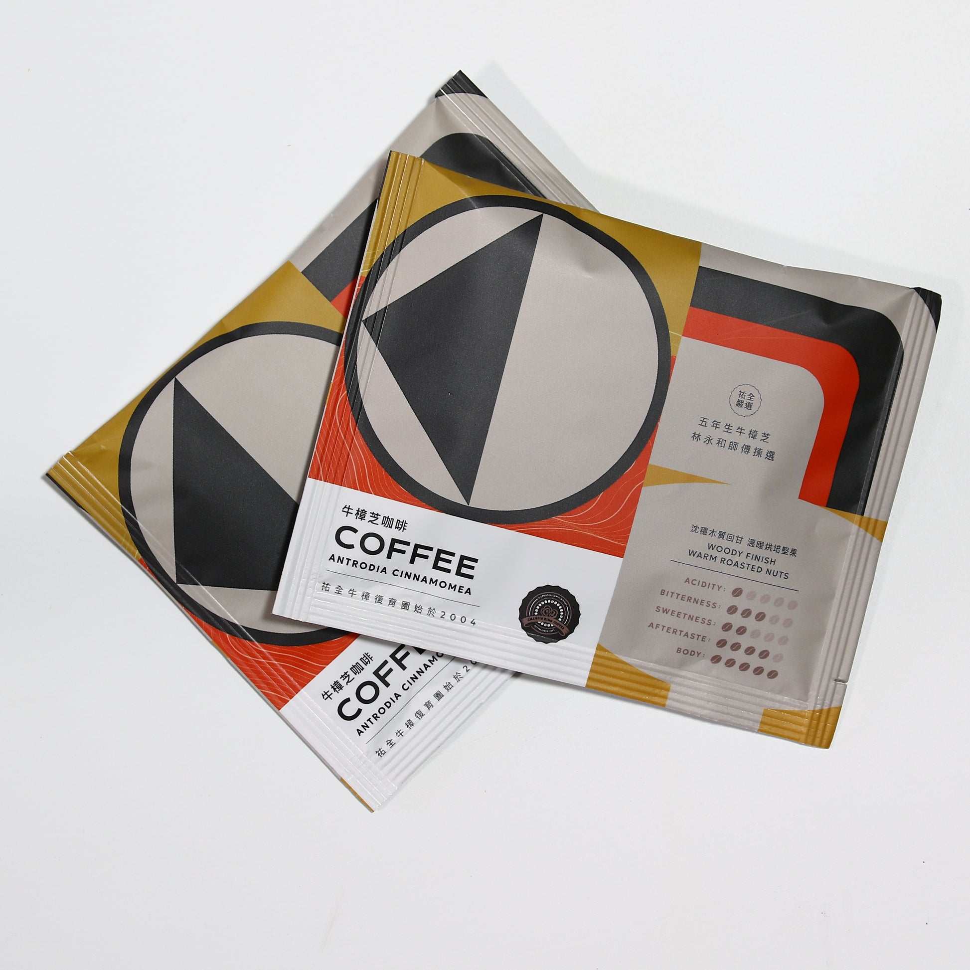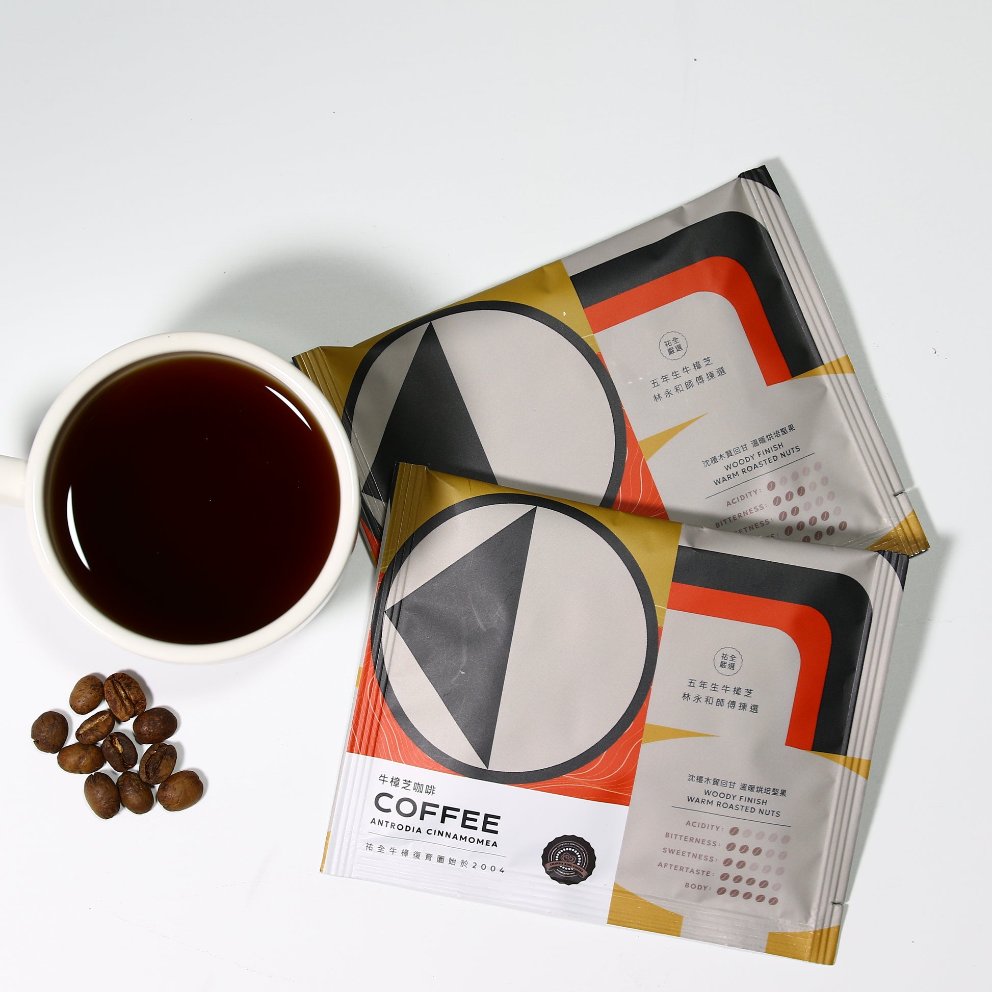 Product Information Ingredients: Five-year-old Antrodia cinnamomea essence, freshly roasted Arabica beans Contains: Triterpenes, camphor acid, chlorogenic acid Antrodia cinnamomea Origin: Taichung Wufeng Youquan Manor Coffee Bean Origin: Central and South America Manufacturing Place: Taiwan Content: 10g/bag, 10 bags per box